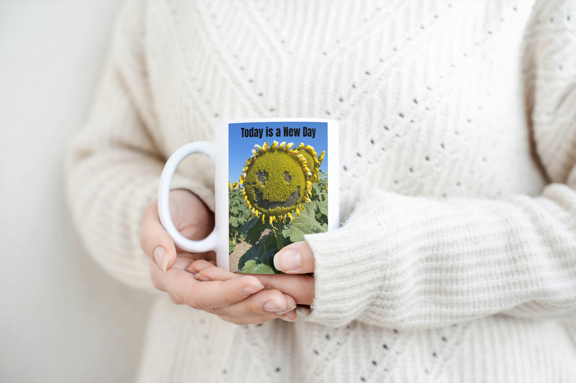 A bright, comforting ceramic mug that brings a gentle lift to slow mornings and sunny afternoons. The front art features a sunflower with a whimsical smiling face under the headline “Today is a New Day,” evoking fresh starts and simple joys. Hold it warm in your hands while you breathe in the morning light, or set it on the desk as a small daily reminder to start over. The clean white ceramic and bold, cheerful print suit casual kitchen counters, home offices, or garden-side coffee breaks.